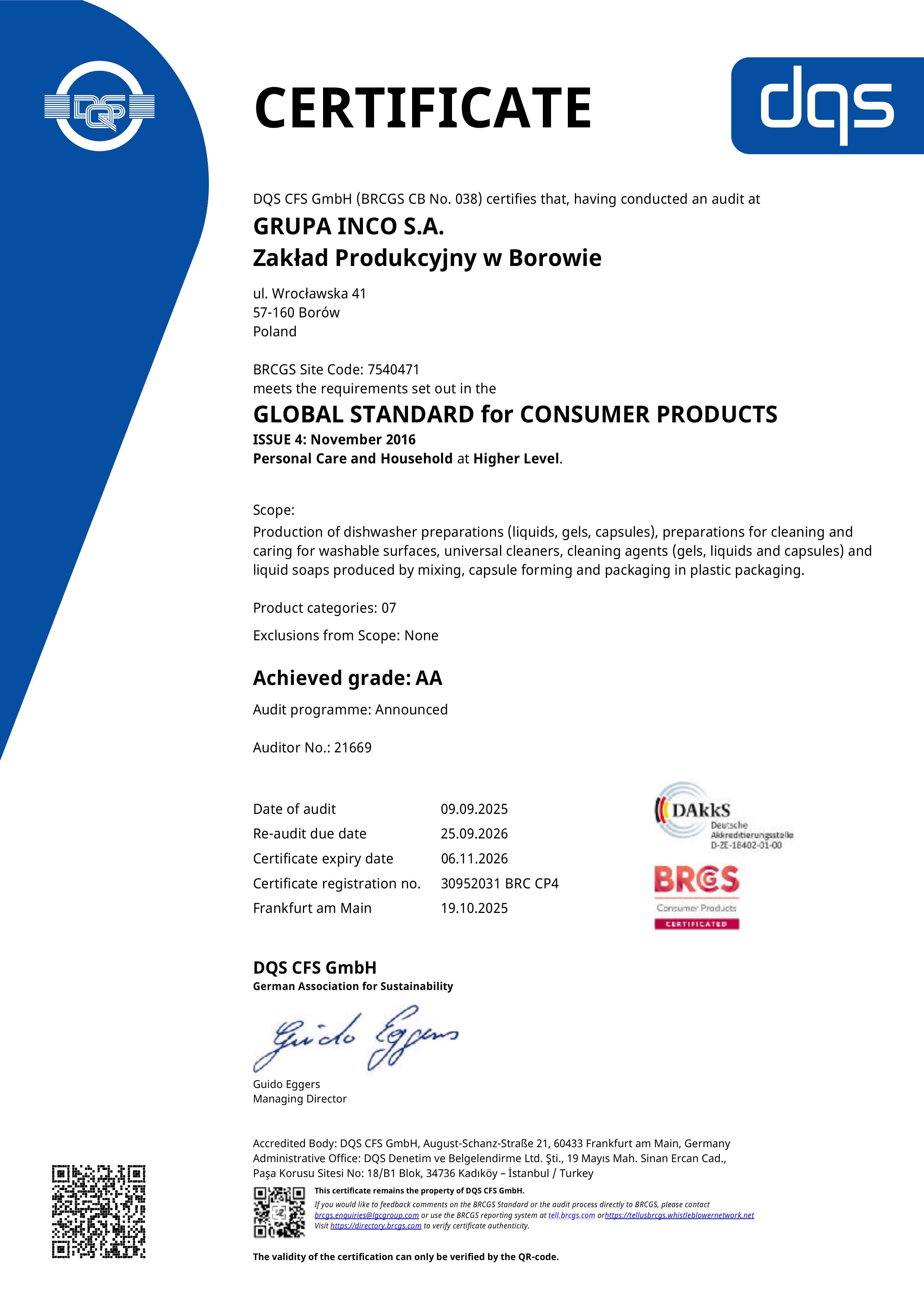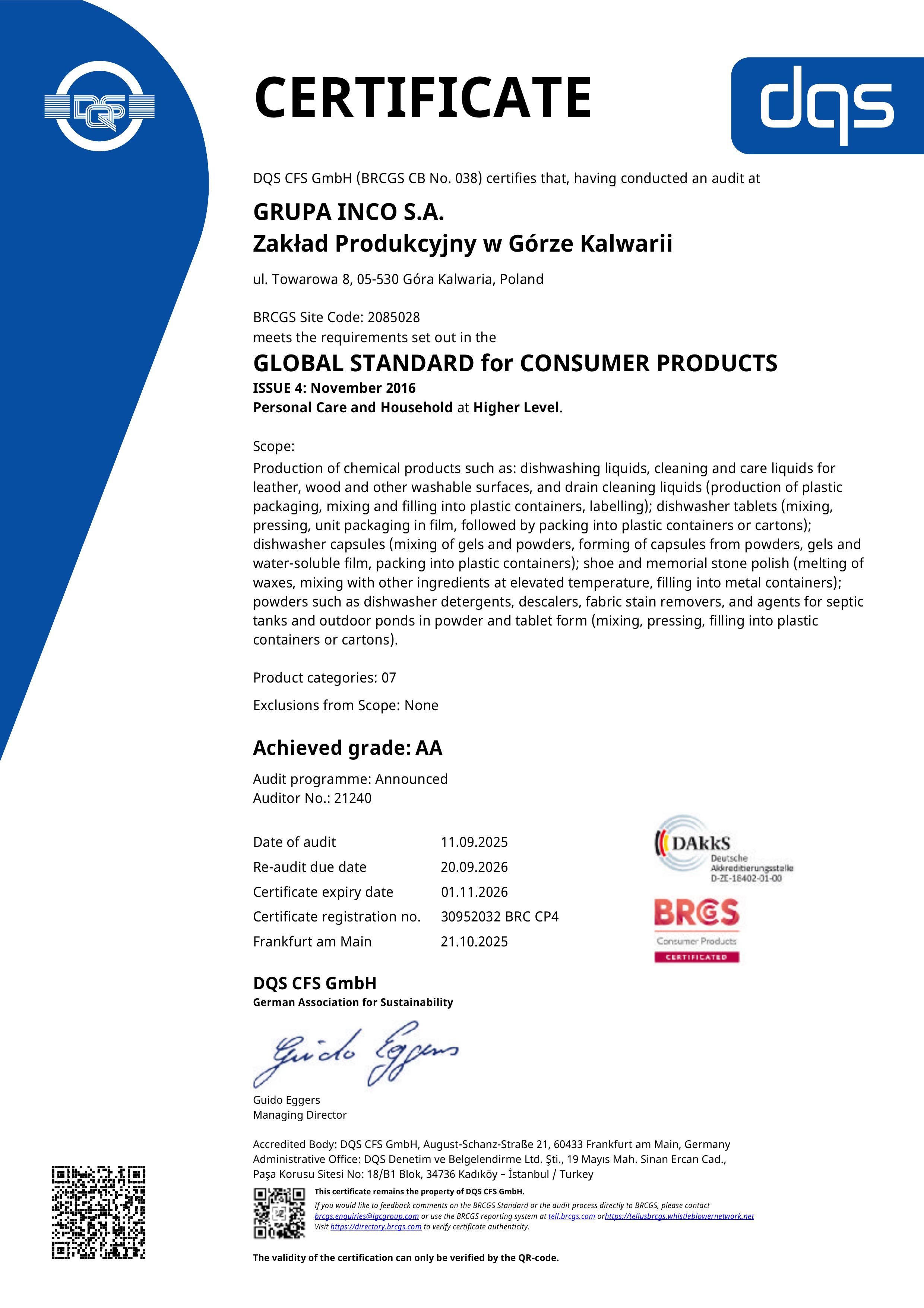 GMP Certificate for Pharmaceuticals Department GRUPA INCO S.A.– certificate of conformity of production conditions with the requirements of Good Manners Practise issued by Main Pharmaceutical Inspectorate on 09.11.2020